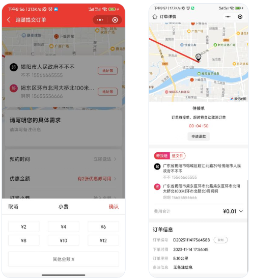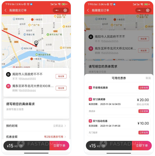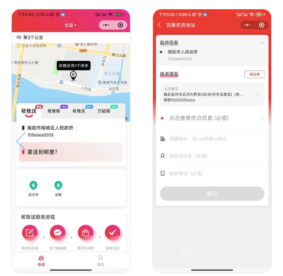 一款基于FastAdmin+ThinkPHP+GatewayWorker+Uniapp开发的同城配送小程序,包含用户端、骑手端、运营后台,支持基础费、骑手配送抽佣、提现抽佣、多区域运营、财务统计,支持后台指派订单、骑手抢单模式,支持优惠券等营销功能,为跑腿团队提供技术解决方案,无加密源码,可私有化部署。